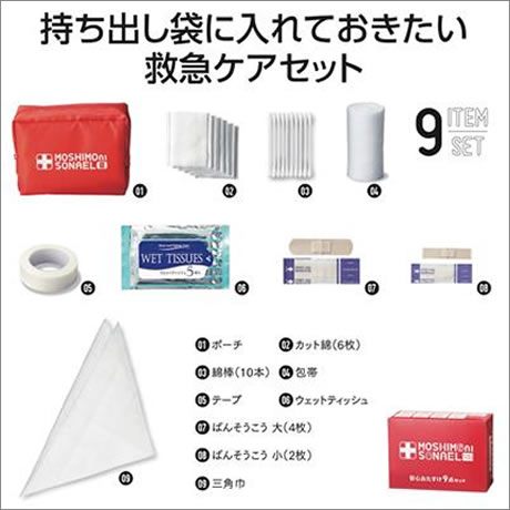 幅広く、救急に対応ができる12アイテムのセット。旅行やドライブ、レジャーや防災用品におすすめ。