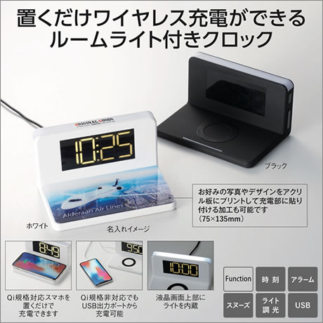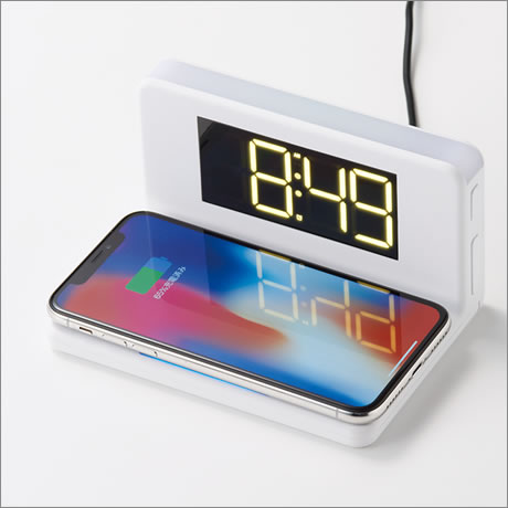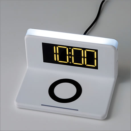置くだけでワイヤレス充電ができるルームライト付きクロック.。Qi対応のスマホを置くだけで充電できます。Qi非対応でもUSB出力ポートから充電可能。