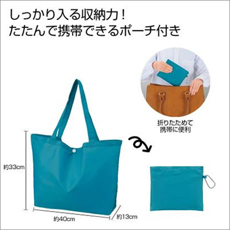 環境(“E”nvironment)に配慮する社会が常識になる生活で活躍するEcolorシリーズ。企業カラーに合わせてカラーチョイスができます しっかり入る収納力が自慢。たたんで携帯できるポーチ付き。厚さ約1.8cm/重量約80g(※必ず現品でご確認ください)でポストインに最適。