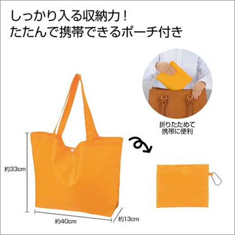 環境(“E”nvironment)に配慮する社会が常識になる生活で活躍するEcolorシリーズ。企業カラーに合わせてカラーチョイスができます しっかり入る収納力が自慢。たたんで携帯できるポーチ付き。厚さ約1.8cm/重量約80g(※必ず現品でご確認ください)でポストインに最適。