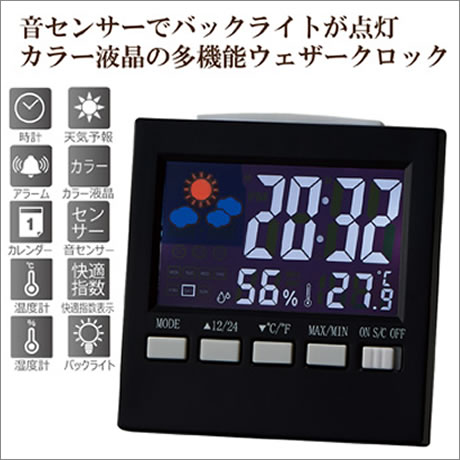 時計、カレンダー、温度計、湿度計、天気予報、バックライト、音センサー