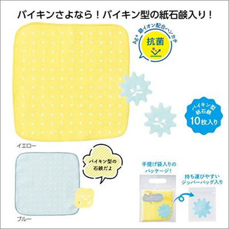 手提げ袋型のパッケージ入り。紙石鹸はジッパーバッグに入っています。 Ag+銀イオン配合抗菌ハンカチでいつでも清潔に。