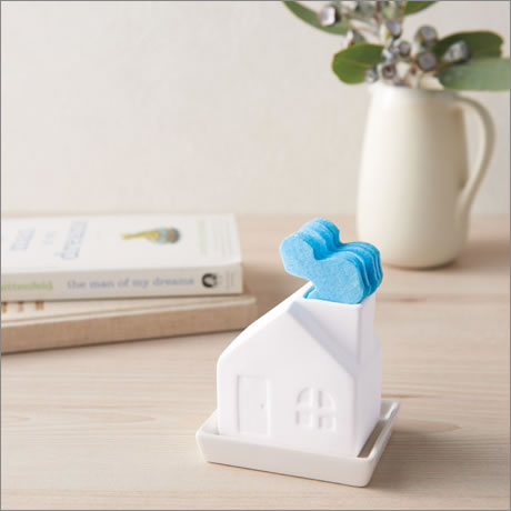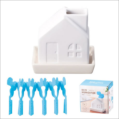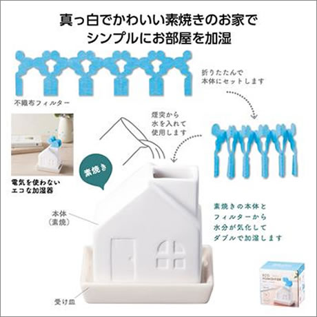 真っ白なかわいい素焼きのお家でシンプルにお部屋を加湿。電気を使わないエコな加湿器です。家の煙突から水を注いで使用します。