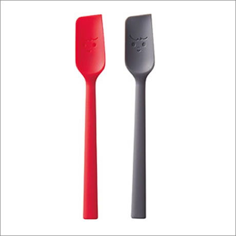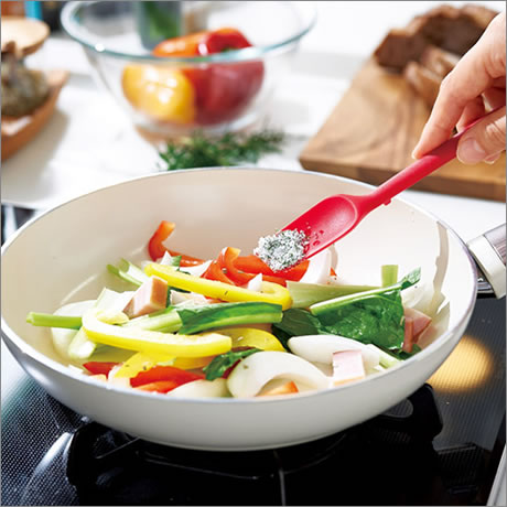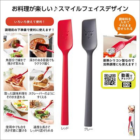 お料理に楽しさを。スマイルフェイスデザイン。使い方は角部分の隅まで取れる、深さのある容器でもらくらく届く、スクレーパーのようにすくえる、取った調理量などをそのまま使える、使用中でも台を汚さずに置ける、適度な長さがあるためしっかりと混ぜられる。