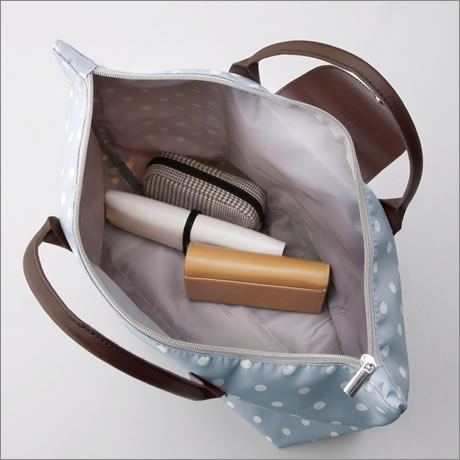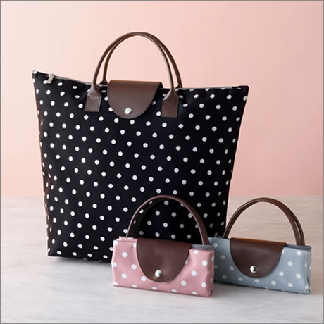 カジュアルなドット柄にレザー調のパーツを効かせた、携帯しやすい折り畳めるバッグ。