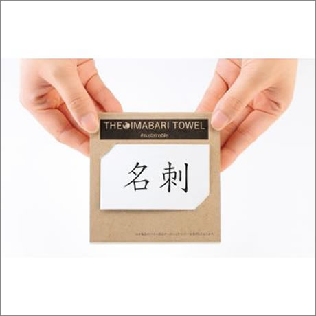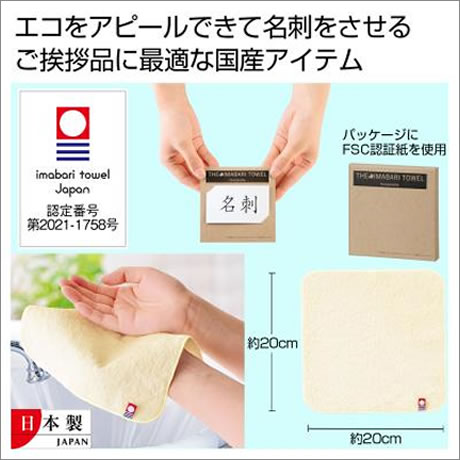 オーガニックコットン使用(パイル部)で無漂白。FSC認証紙を使用した、名刺が差せるクラフトボックス入り。