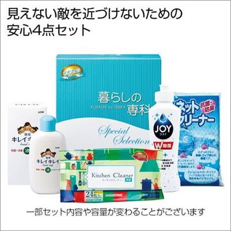 ・ライオン キレイキレイ薬用液体ハンドソープ120ml(箱入)×1 ・P&G 除菌ジョイコンパクト175ml(さわやか微香)×1 ・除菌キッチンクリーナー24枚×1 ・ネットクリーナー×1