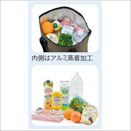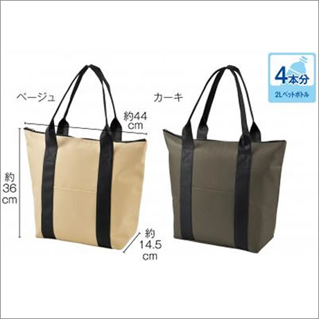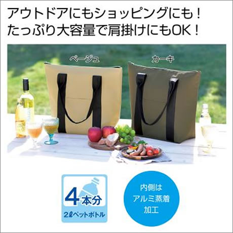 内側にアルミ蒸着付きで何かと便利な外ポケット付き。容量は2Lペットボトル4本分。
