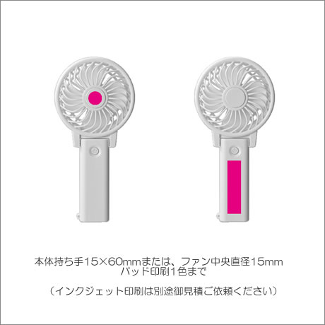 本体持ち手15×60mmまたは、ファン中央直径15mm パッド印刷1色まで(インクジェット印刷は別途御見積ご依頼ください)