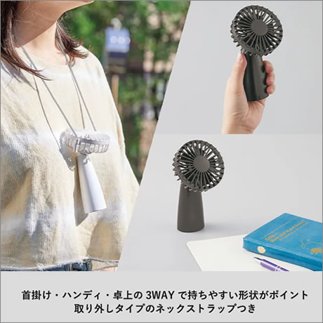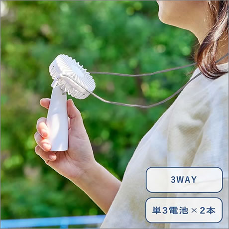 "使用シーンでスタンドファン、首掛けファン、ハンディファンと3WAYに使い分けのできる乾電池タイプのファン。