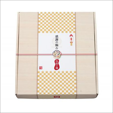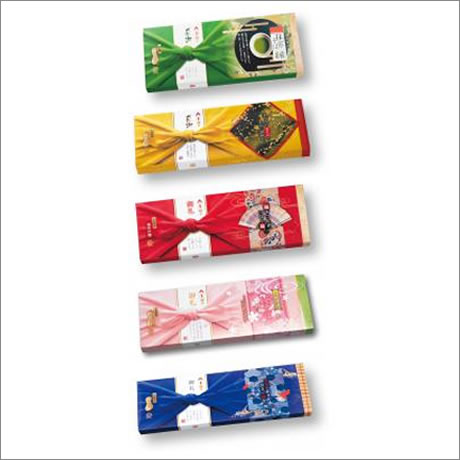 カラフルな風呂敷包みデザインの箱に入った麺が5種類、熨斗掛けデザインの化粧箱にセットされています。箱を開けた瞬間の驚きは格別です! 各色化粧箱には名刺を差し込める差し込み穴が空いています。