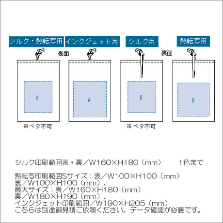 熱転写印刷範囲Sサイズ:表/W100×H100(mm)裏/W100×H100(mm)、最大サイズ:表/W160×H180(mm)裏/W180×H190(mm)、インクジェット印刷範囲/W190×H205(mm) こちらは別途御見積ご依頼ください。データ確認が必要です。 |