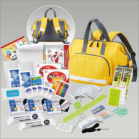 緊急時に両手を空けて避難することが出来るリュックタイプの防災セット。バッグの開口部はがま口風で中が見やすい。子供向けのグッズを揃えた防災セットです。 <セット内容>