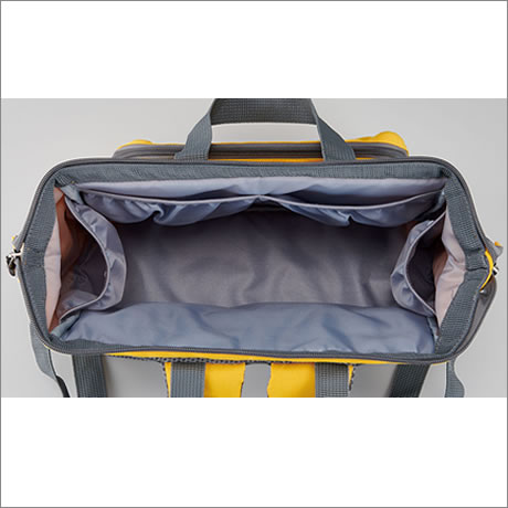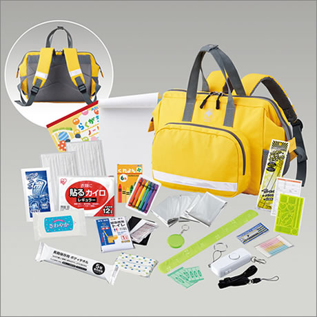 緊急時に両手を空けて避難することが出来るリュックタイプの防災セット。バッグの開口部はがま口風で中が見やすい。子供向けのグッズを揃えた防災セットです。