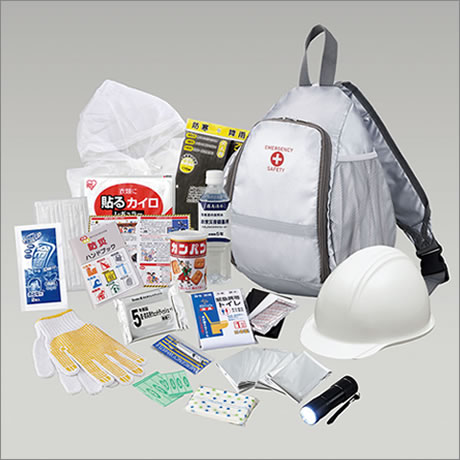 地震発生直後から避難場所へプラス帰宅支援までを視野に入れたヘルメット付き避難セット。