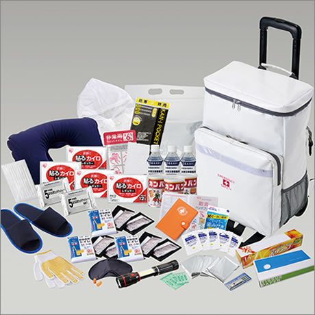 地震災害だけでなく、近年多発している集中豪雨災害にも対応した避難セットです。キャリー付きで保存水等が入った重たい荷物の場合も移動が楽! キャリーは取り外し可能でリュックとしても使用出来ます。