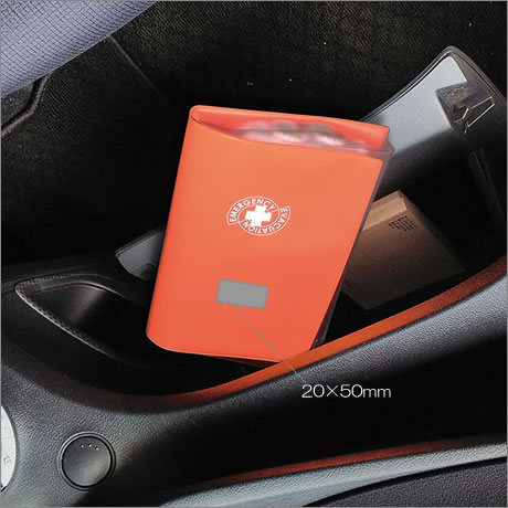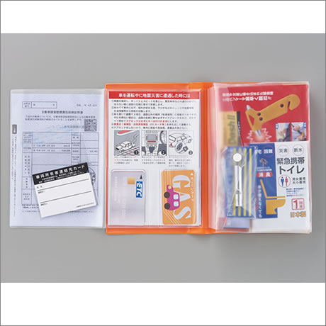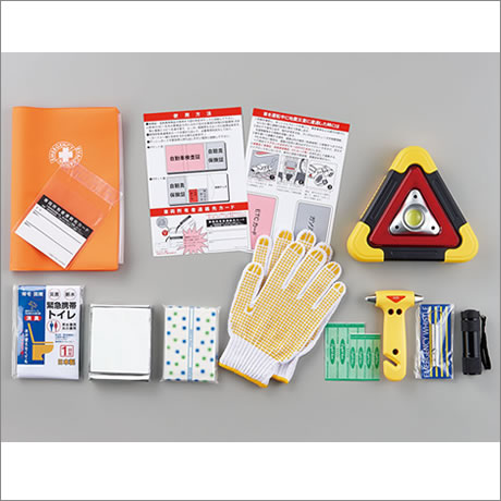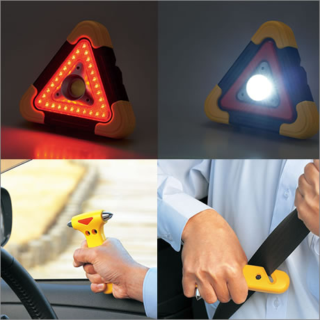 ダッシュボード収納可能サイズのケースに最低限必要な避難用品をまとめたキットと緊急表示灯として安全を守る三角停止板型ライトのセット。