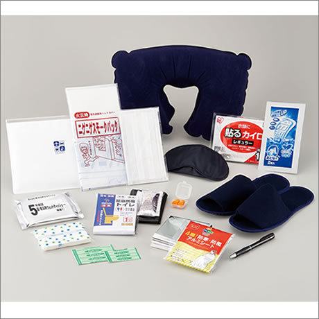 旅行や出張中に役立つトラベルグッズと、災害時に役立つ防災グッズをセットにした、旅行用防災セット。