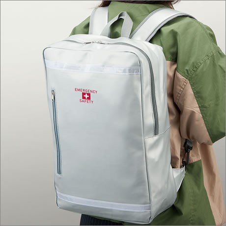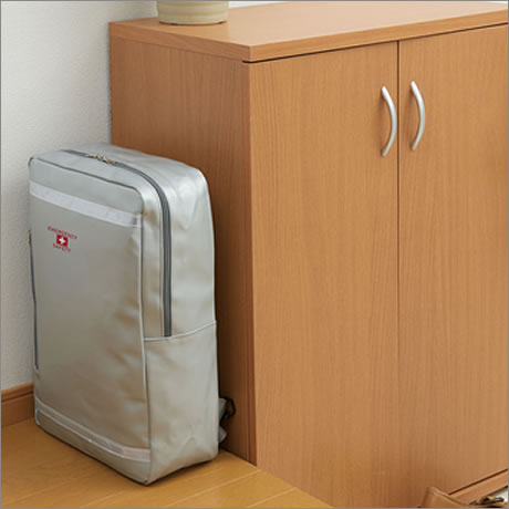 スマートなデザインと防災イメージを両立させたリュックバッグタイプの避難セット。置く場所を選ばず、ご家庭の玄関でも違和感なく、オフィスや物置でも長方型で保管スペースの無駄も少なく保管できます。