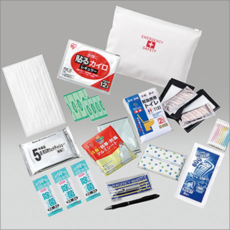 いつ起こっても不思議ではない災害。その災害に遭うのは自宅やオフィスに居る時とは限りません。外出時に起こった場合に最低限用意したい防災対策グッズを常に持ち歩く携帯用としてセットしました。