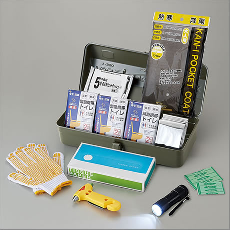 ツールボックス、脱出ハンマー、緊急携帯トイレ(大小兼用)2P×3、ボックスティッシュ