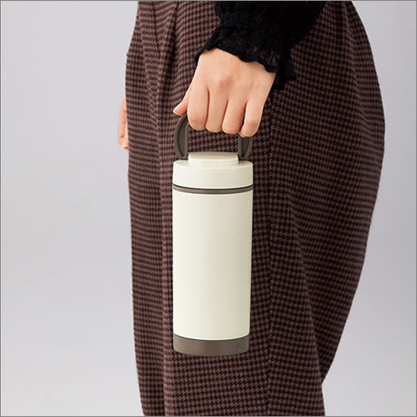 熱伝導や結露に強い二重構造と収納可能なハンドル付きボトルでブレイクタイムを快適に。