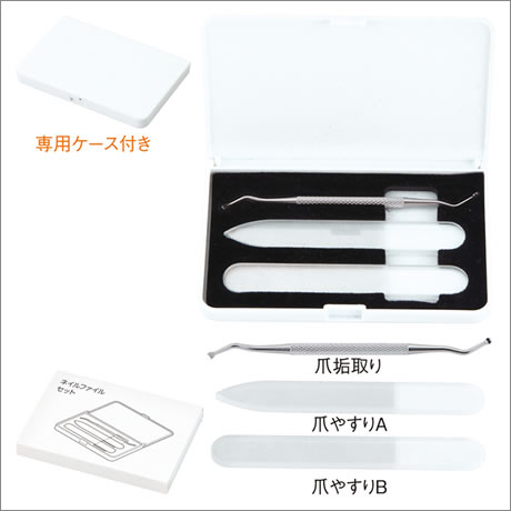 | 本体サイズ | ケース:70×107×10mm 爪やすりA・B:13×90×3mm 爪垢取り:6×98×4mm |