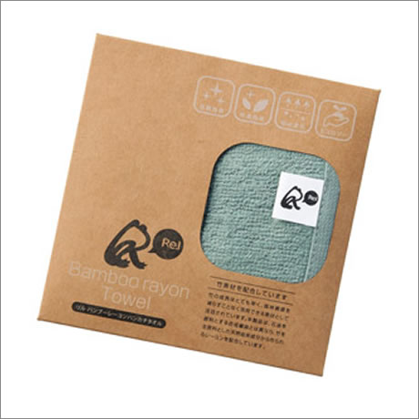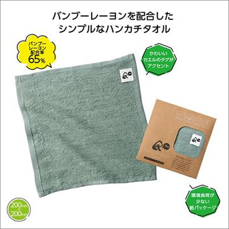 バンブーレーヨンを65%配合したハンカチタオル。環境負荷の少ない紙パッケージでエコイベントなどのノベルティにおすすめ。