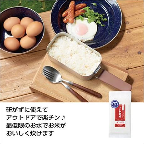研がずに炊ける、アウトドアで便利な真空パックの無洗米。最低限のお水でお米を美味しく炊けます。