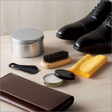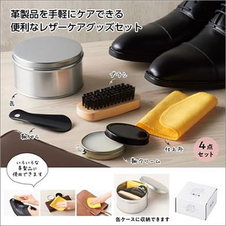 革製品を手軽にケアができる便利なレザーケアグッズセット。缶にはいっているのは汚れ落とし用のぶらし、艶出しの靴クリーム、仕上げようの布に、履き心地をよくする靴べらいり。靴に限らず、バッグや小物にもご使用いただけます。(※必ずパッチテストを行ってください)