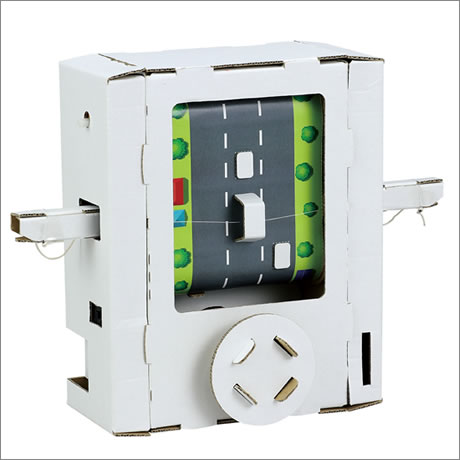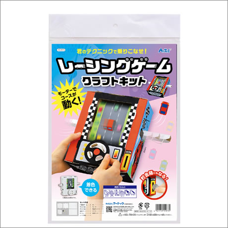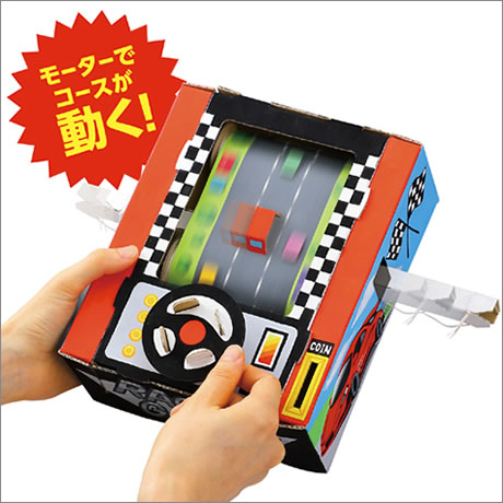 ハンドルを回転させてモーターで動くコースの障害物を避けよう印刷済みのコース付※商品は白無地です。単3電池x2本(別売)