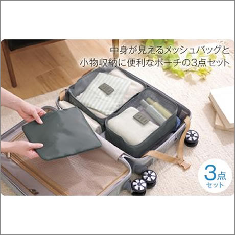 タグがおしゃれな中身が見えるメッシュバッグ2個と、小物収納に便利なフラットポーチの3点セット。