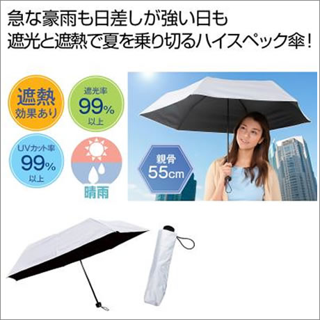 遮光率99%、遮蔽率(UVカット率)99%に加えて「遮熱効果」まで謳えるところが最大のポイント!車や職場に1本置いておけば安心の全天候対応タイプ。男女問わず使いやすい3カラー(ホワイト/グレー/シーブルー)を単色指定でご用意しております。