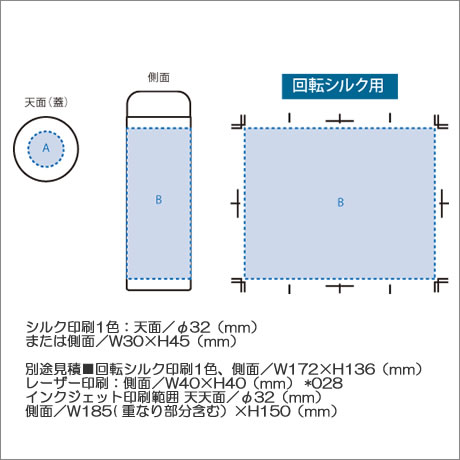 別途見積■回転シルク印刷1色、側面/W172×H136(mm)、レーザー印刷:側面/W40×H40(mm) *028 インクジェット印刷範囲 天天面/φ32(mm)、側面/W185( 重なり部分含む)×H150(mm)" |