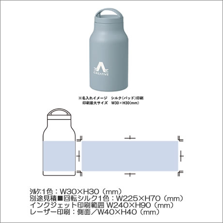 別途見積■回転シルク1色:W225×H70(mm)、インクジェット印刷範囲 W240( 塗り足し範囲を含む)×H90(mm)、レーザー印刷:側面/W40×H40(mm) |