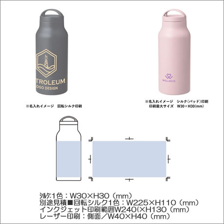 別途見積■回転シルク1色:W225×H110(mm)、インクジェット印刷範囲W240( 塗り足し範囲を含む)×H130(mm)、レーザー印刷:側面/W40×H40(mm) |