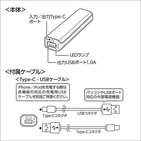 取説付、最大出力1A、バッテリー容量2200mAh、本体重量66g、Type-Cケーブル付属