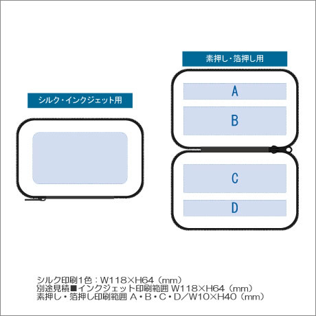 | 備考 | シルク印刷1色:W118×H64(mm) 別途見積■インクジェット印刷範囲 W118×H64(mm)、素押し・箔押し印刷範囲 A・B・C・D/W10×H40(mm) |