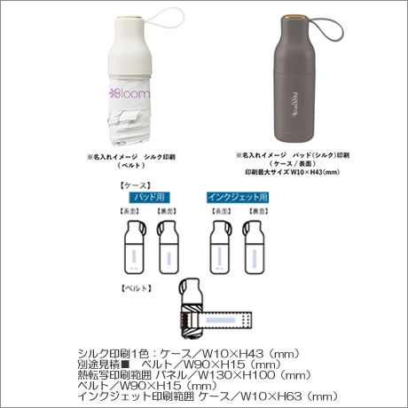 | 備考 | シルク印刷1色:ケース/W10×H43(mm) 別途見積■ ベルト/W90×H15(mm)、熱転写印刷範囲 パネル/W130×H100(mm) ベルト/W90×H15(mm)、 インクジェット印刷範囲 ケース/W10×H63(mm) |