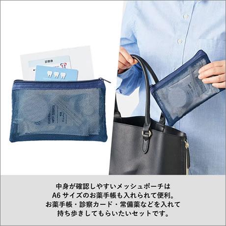 メッシュポーチにはA6サイズのお薬手帳も入るためその他診察カード・常備薬などと一緒にまとめて持ち運ぶことができて便利です。