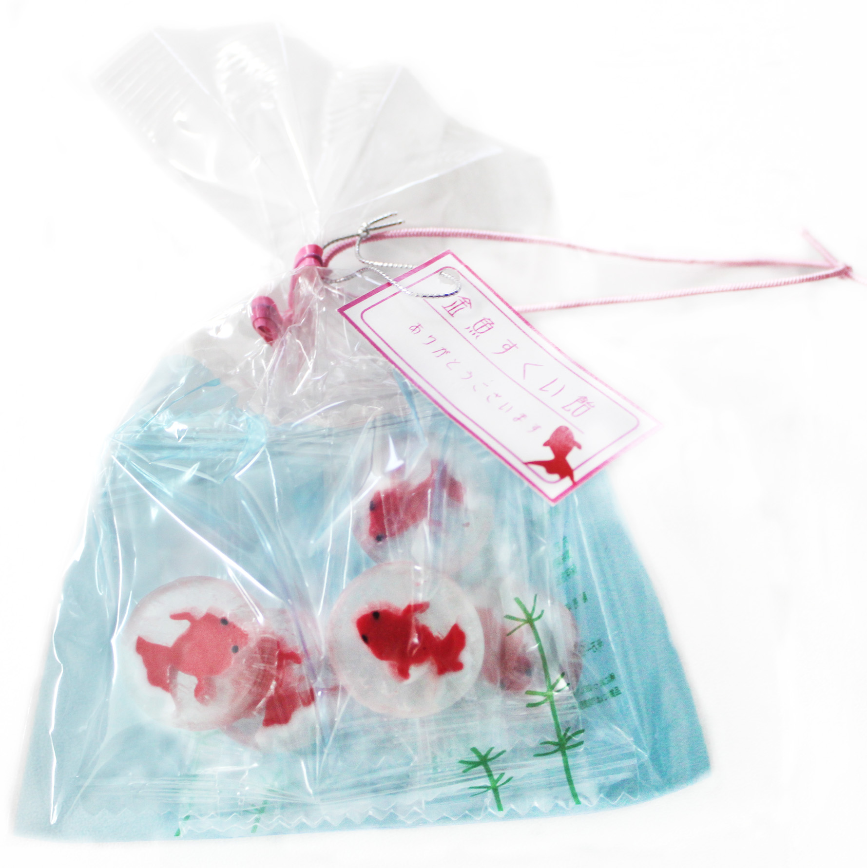 5粒はいったキャンディに金魚が描かれて、まるで金魚すくいのおみやげのよう。パッケージに水の色、水草のデザイン、タグにもかわいい金魚が描かれています。飴は甘酸っぱいレモン味です。