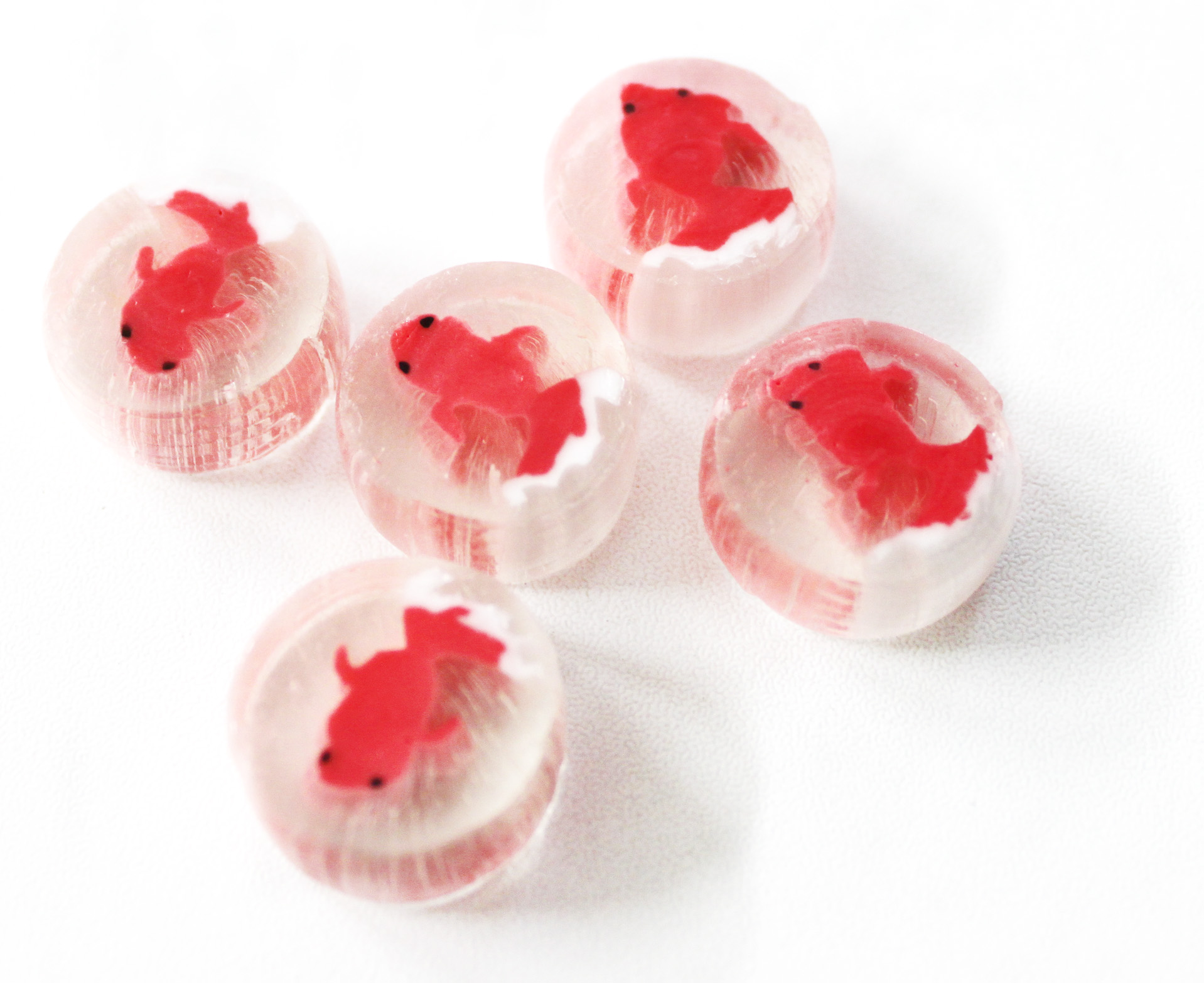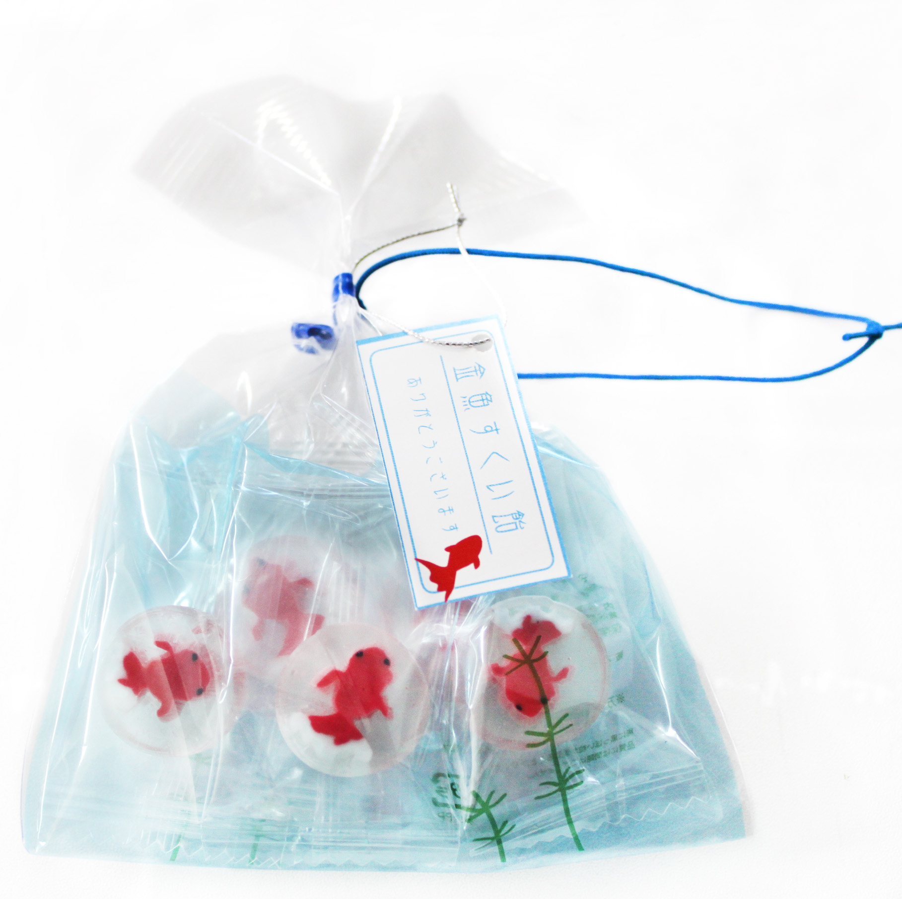 5粒はいったキャンディに金魚が描かれて、まるで金魚すくいのおみやげのよう。パッケージに水の色、水草のデザイン、タグにもかわいい金魚が描かれています。飴は甘酸っぱいレモン味です。