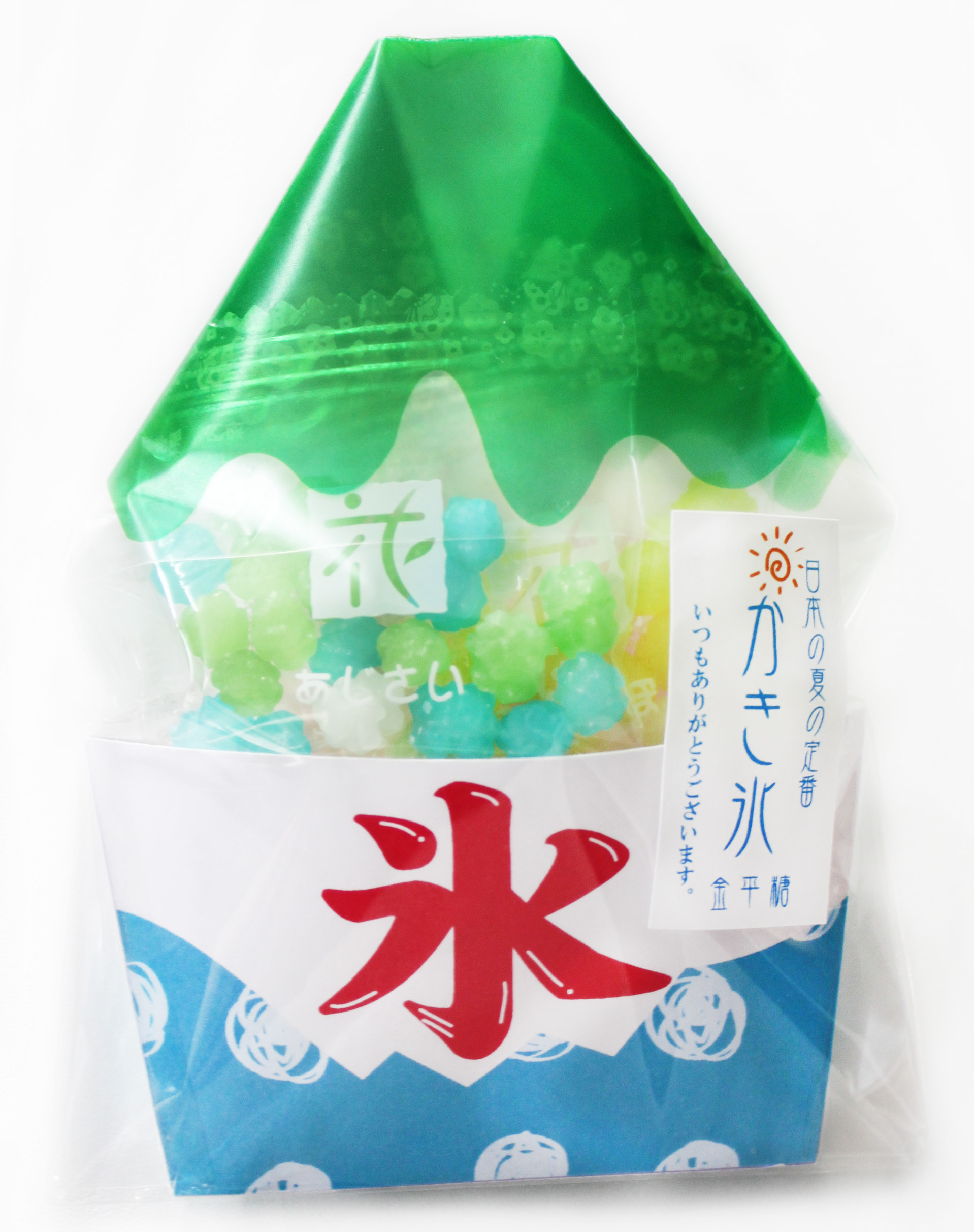 シャリシャリの氷に、あま?いシロップのかかった定番かき氷に見立てたデザイン袋に、彩りきれいな金平糖が5袋はいっています。