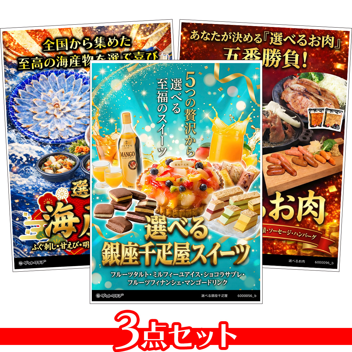 - 人気の産地直送品をメインに、選べる海産物・お肉・スイーツなどの人気の目録・引換券をまとめた「A3パネル目録景品セット」